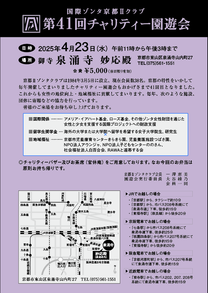 京都Ⅱゾンタクラブは1984年3月5日に設立、2024年に創立40周年を迎えました。現在会員数38名。毎年開催してまいりましたチャリティー園遊会もおかげさまで41回となりました。これからも女性の地位向上・地域福祉に貢献して参ります。